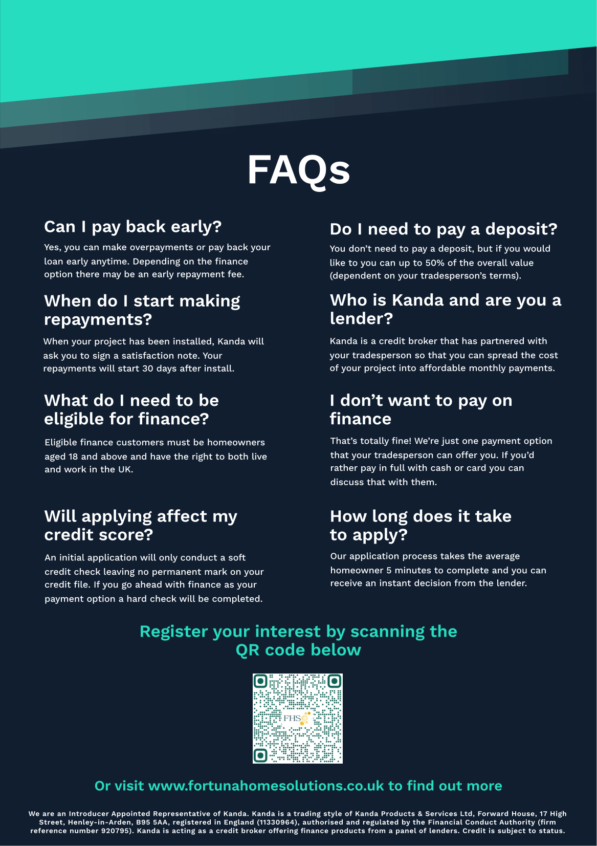 Kanda is a UK-based credit broker that works with a panel of lenders to offer fair and competitive finance products for home improvements. Fortuna Home Solutions is an Introducer Appointed Representative of Kanda – we introduce you to their platform, but we are not the lender and we do not make the credit decision. This separation ensures your application is assessed independently and in line with financial regulations.