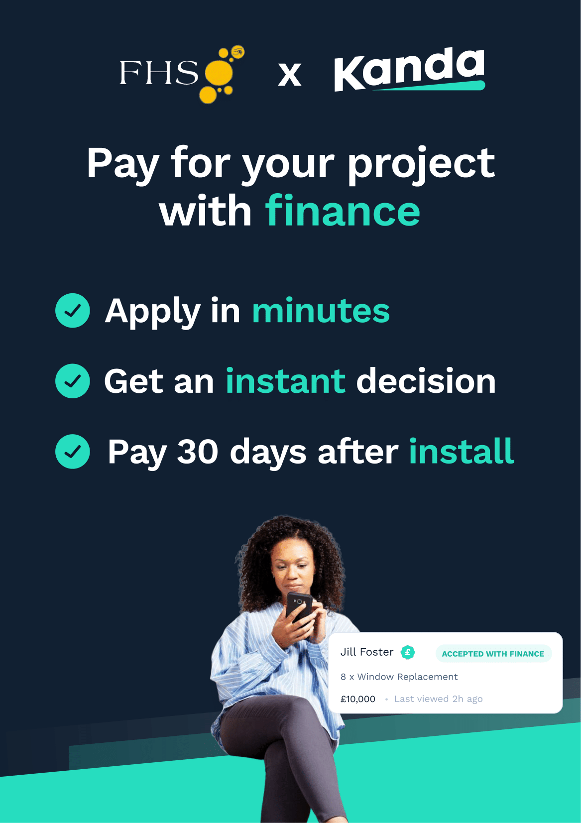 Spread the cost of your windows, doors and conservatories with flexible, transparent finance options from FHS in partnership with Kanda – apply in minutes, get an instant decision and start paying only after your installation is complete.