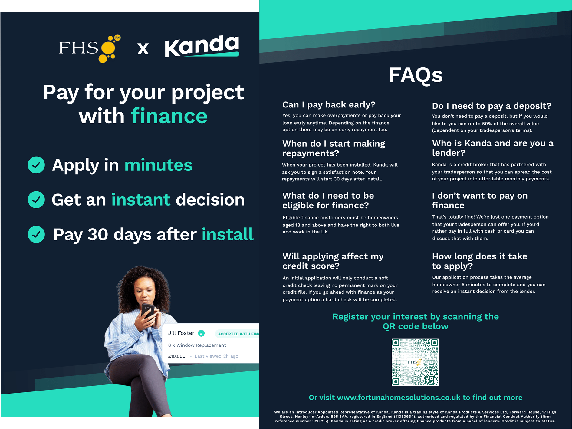 The online finance form usually takes around five minutes to complete and can be done on your mobile, tablet or computer. Once submitted, you will receive an instant decision from the lender. To begin, simply speak to your FHS consultant during your survey or quotation appointment and we will send you a secure link to the Kanda platform so you can apply at a time that suits you.